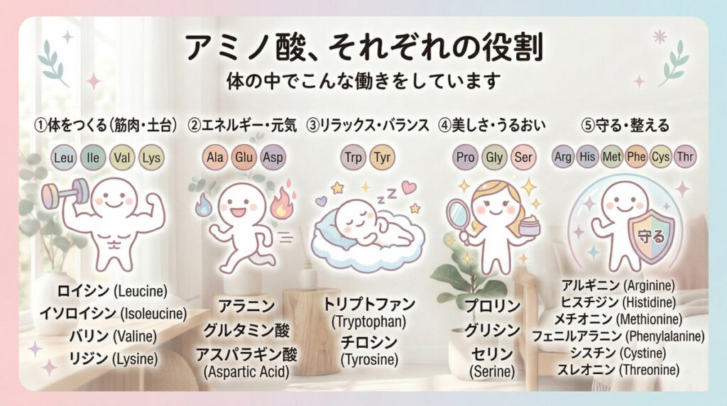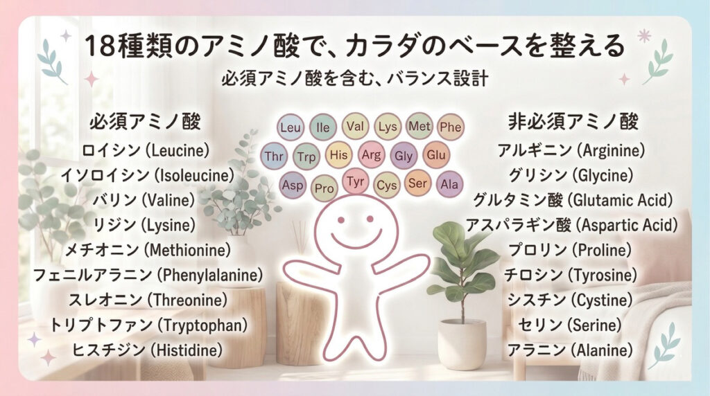 紅景天に含まれる(必須+非必須アミノ酸) 18種類は下記になります。