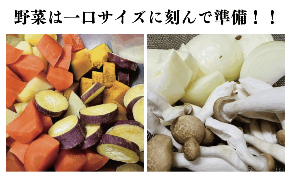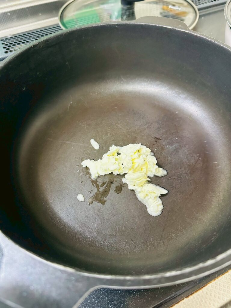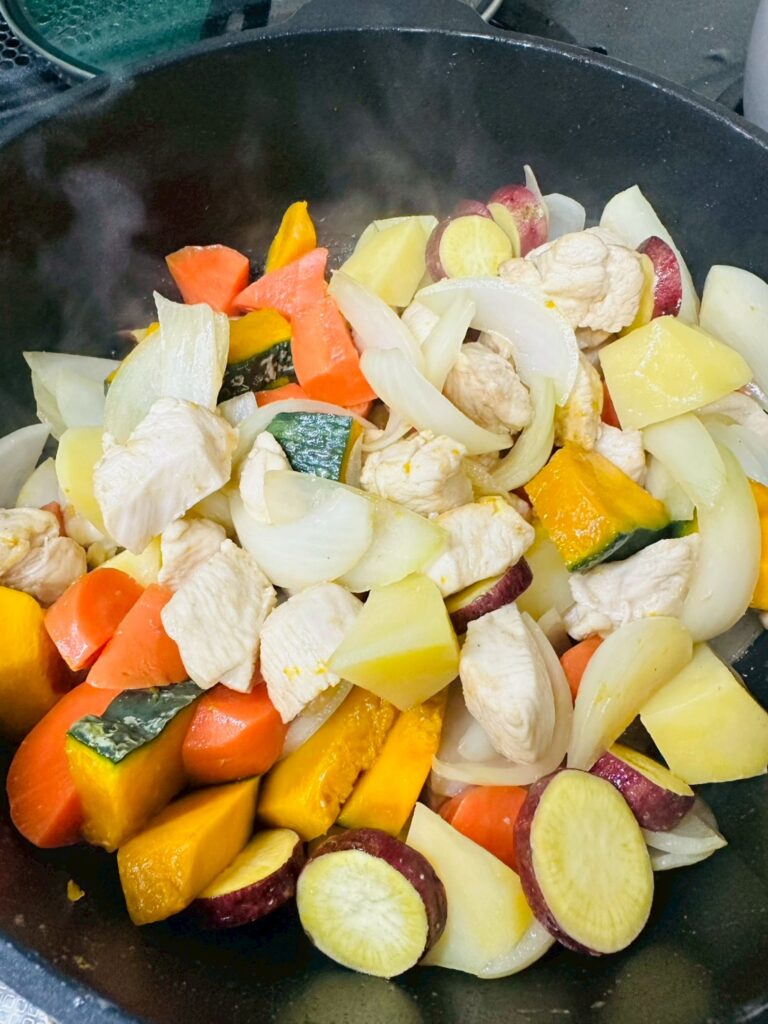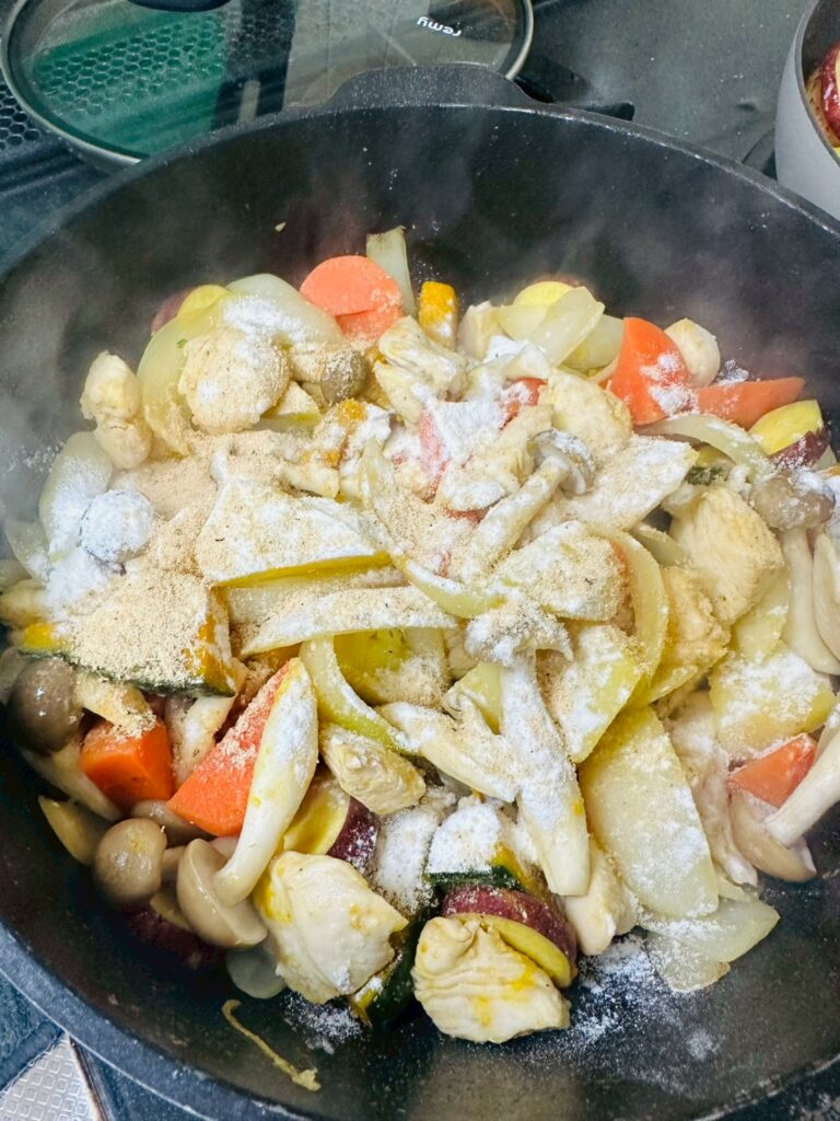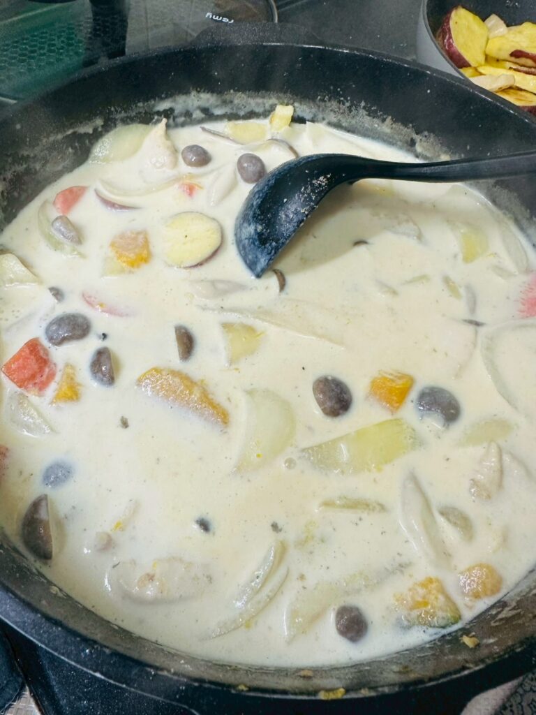 バターで炒めた野菜に、みりん・米粉・2470スープを絡めてから牛乳を投入🥛