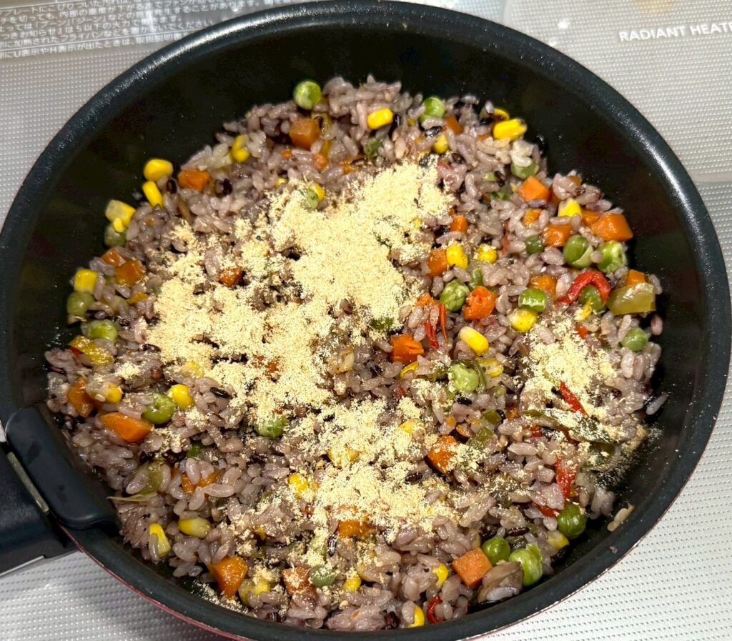 2️⃣ 洗わないお米と六穀豊穣を入れ、中火でザックリ2〜3分炒める