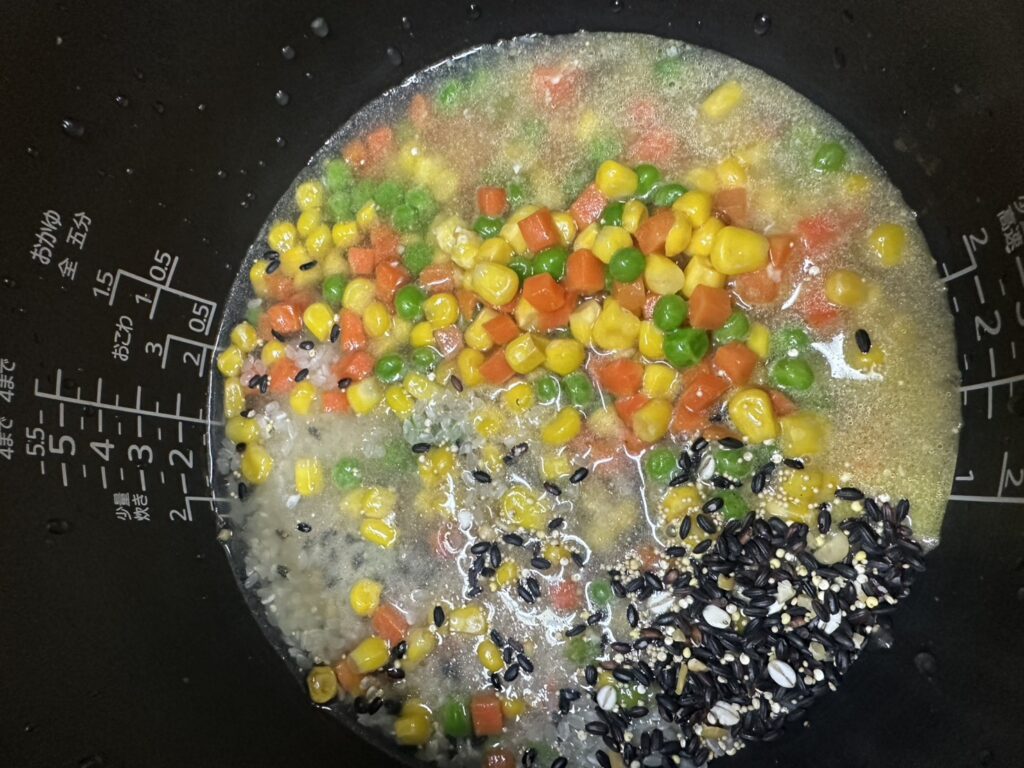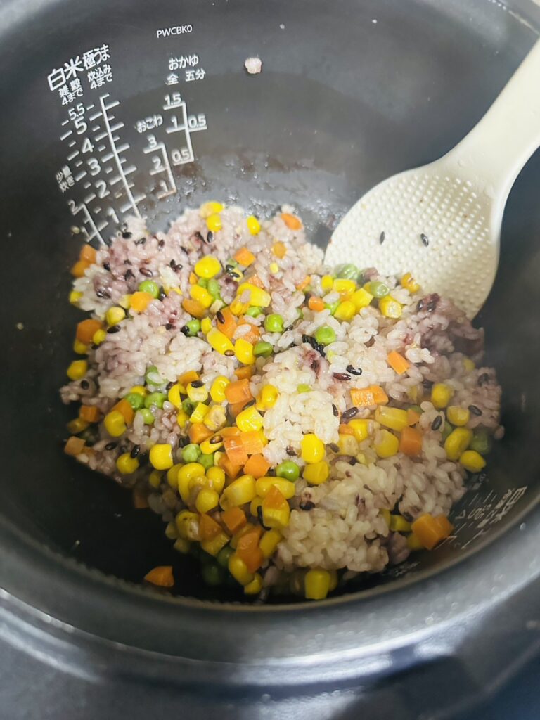 2️⃣ 炊飯器に白米・六穀豊穣・炒めたミックスベジタブル・コンソメ・水(通常の分量)を入れて炊くだけ!