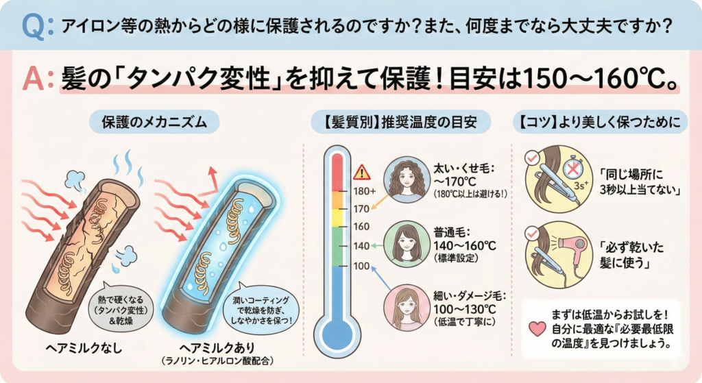 一般的に髪がダメージを受けやすくなる目安は、150℃〜160℃です。弊社のヘアミルク(ラノリン・ヒアルロン酸配合)をなじませることで、熱による急激な乾燥を防ぎ、しなやかさを保ちます。