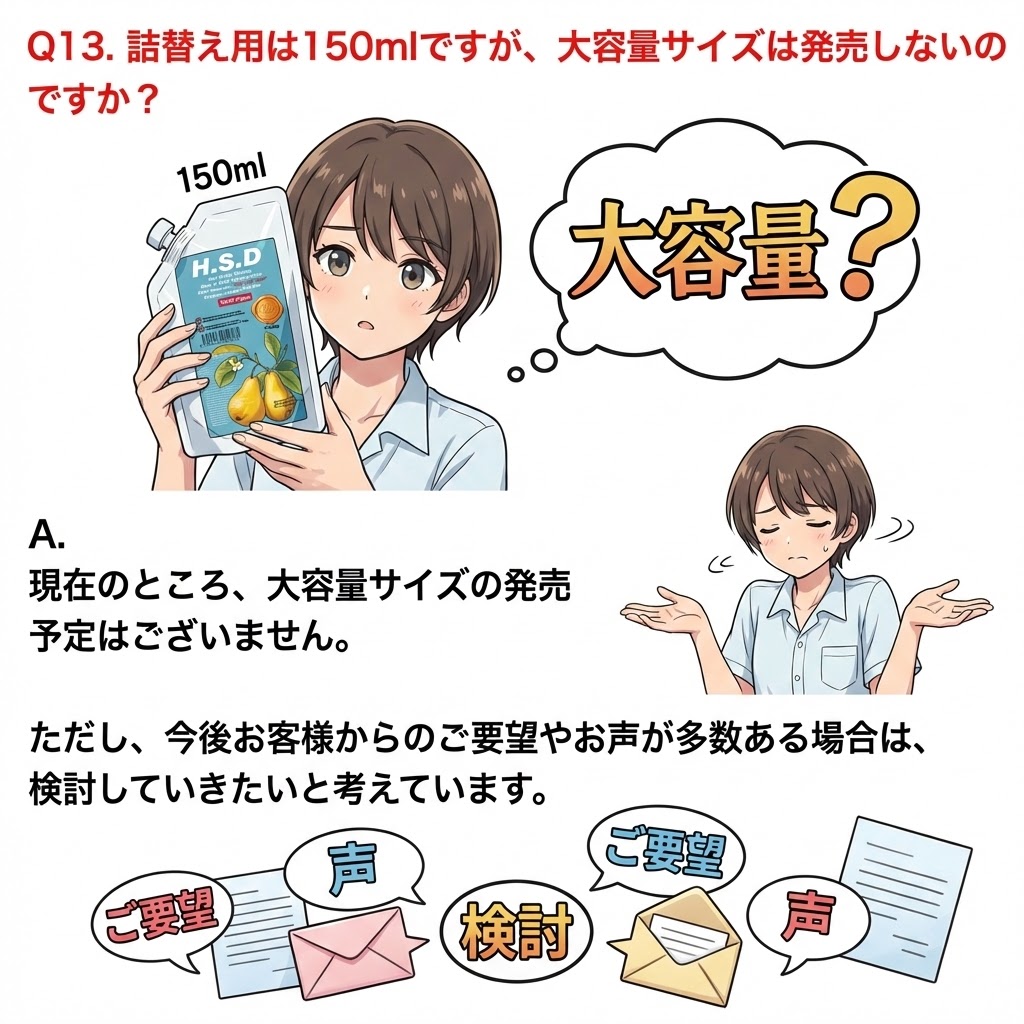 Q13. 詰替え用は150mlですが、大容量サイズは発売しないのですか?